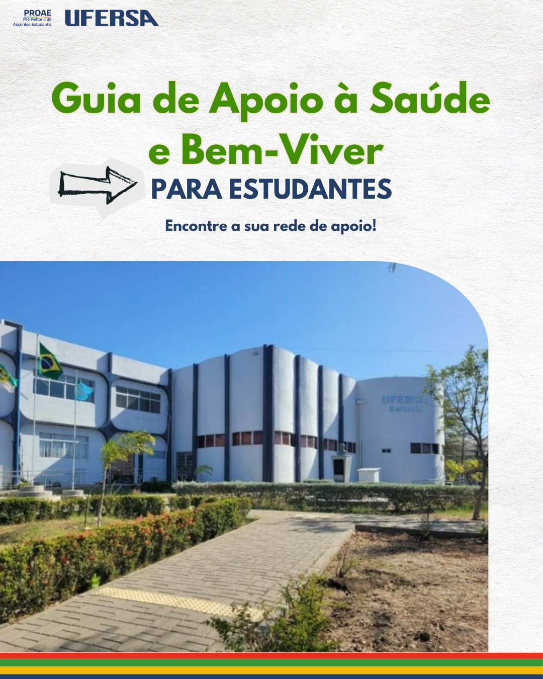 A Pró-Reitoria de Assuntos Estudantis (Proae) torna público o Guia de Apoio à Saúde e Bem-Viver do(a) Estudante, que foi construído pelos(as) servidores(as) e estagiárias da assistência estudantil, apresentando uma rede serviços e equipamentos presentes na Universidade Federal Rural do Semi-Àrido (Ufersa) e nas cidades em que os campi da Ufersa estão localizados. Esperamos que este guia seja um instrumento que auxilie os(as) estudantes na busca por serviços de apoio e suporte à saúde e bem-viver.